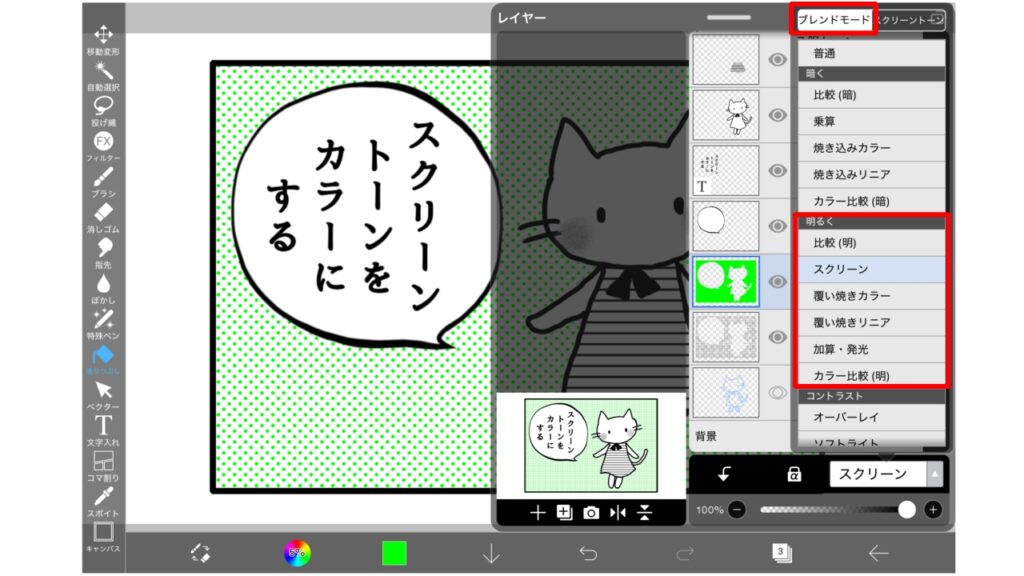 ブレンドモードの場合は、スクリーントーンのレイヤーと、色を塗ったレイヤーを合わせることができません。