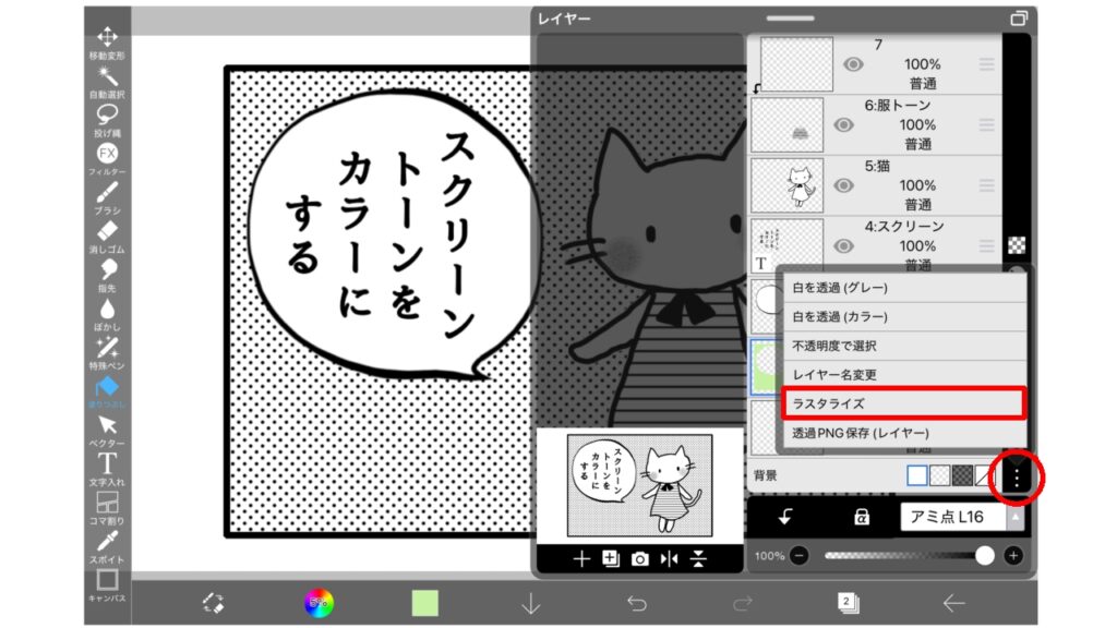 ラスタライズでは、スクリーントーンの柄の色そのものを変化させることができるのです。
