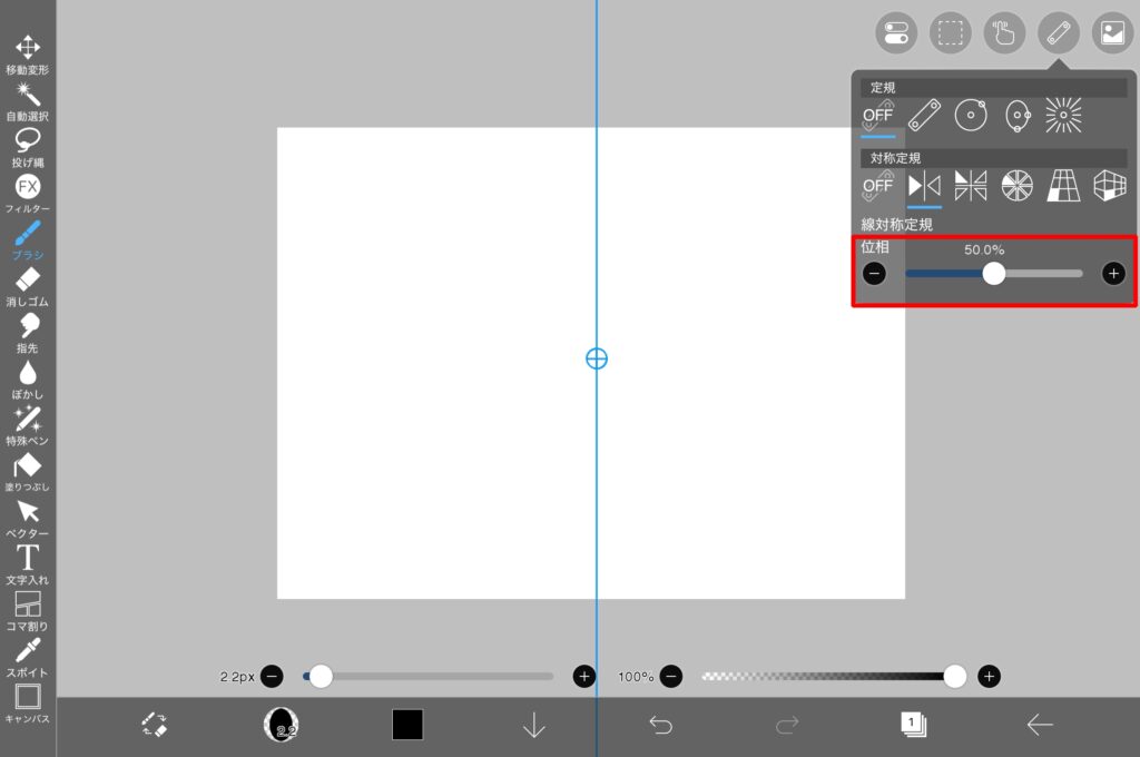 描画したい場所の中央に線対称定規を合わせます。真ん中の丸プラス印をドラッグすることで定規の移動ができます。