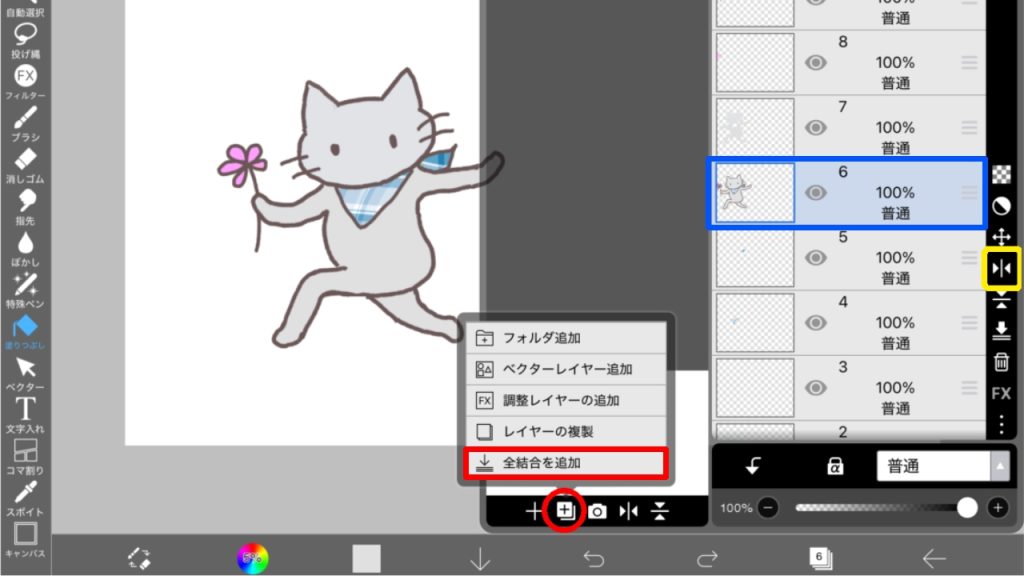 丸印のアイコンから「全結合を追加」をクリックすると1枚にまとまったレイヤーができます。