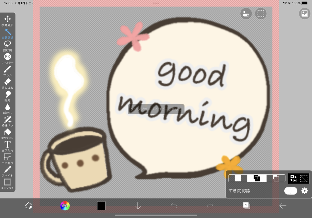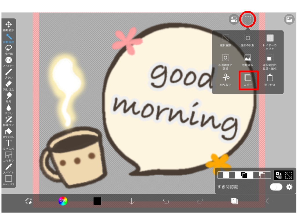 再度「自動選択」をクリックすると、先の右下の表示が消えますので、丸型アイコンから「コピー」を選択してください。