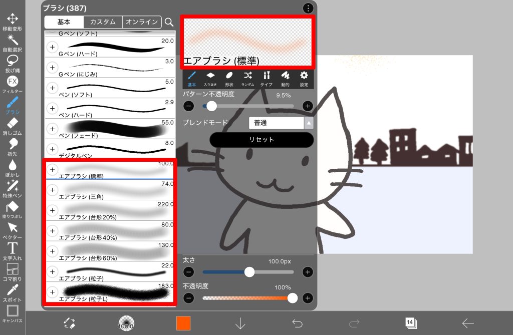1. ブラシメニューから「エアブラシ(標準)」を選ぶ